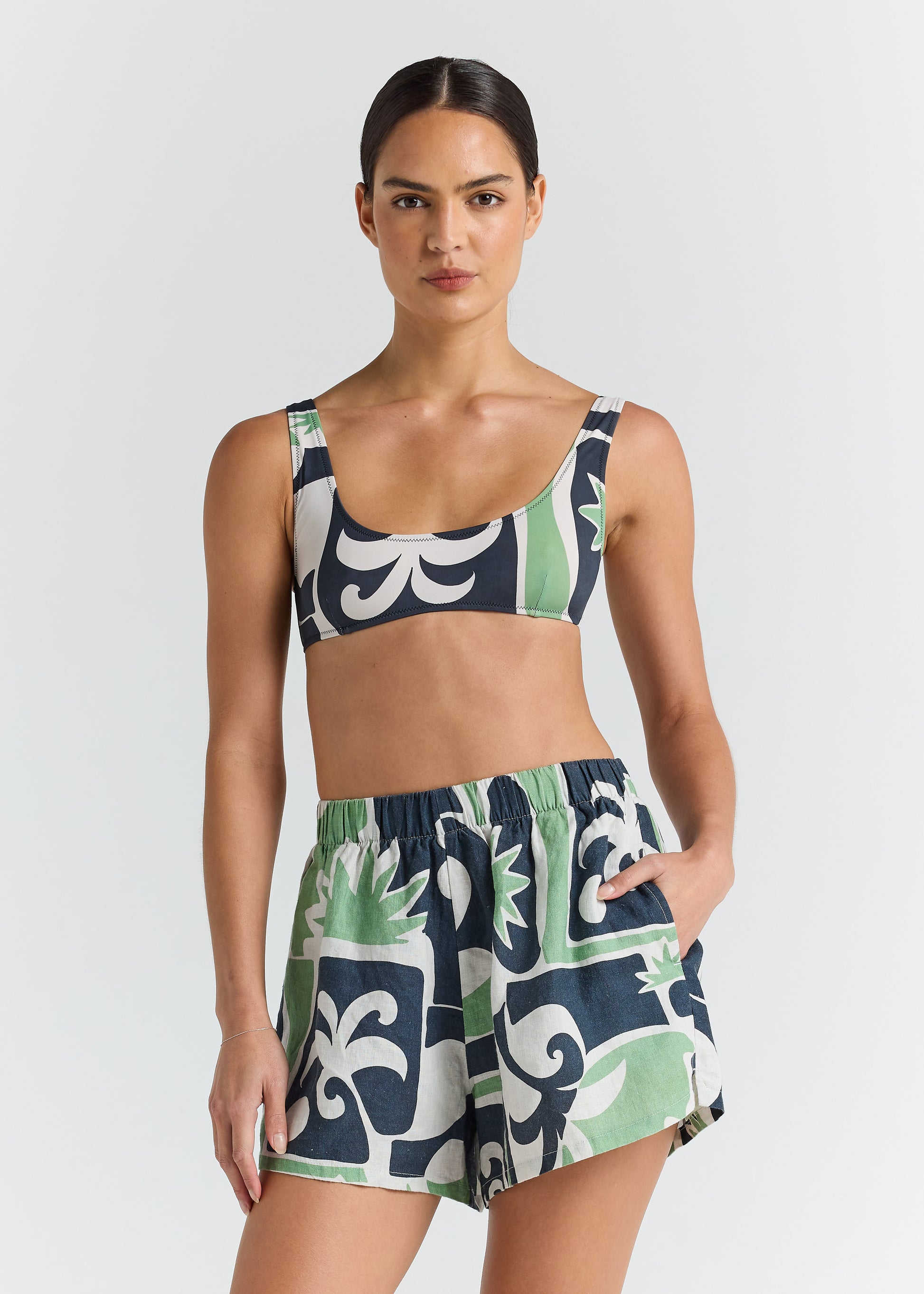 An easy summer staple, the Beachcomber Slit Short is crafted from airy 100% Linen in our exclusive hand-drawn palm print. Designed with an elasticated waistband, a relaxed silhouette, and a flattering mini side slit for movement and ease. Pair with the matching Overshirt for coordinated vacation dressing or throw on over your swim for an effortless poolside look.