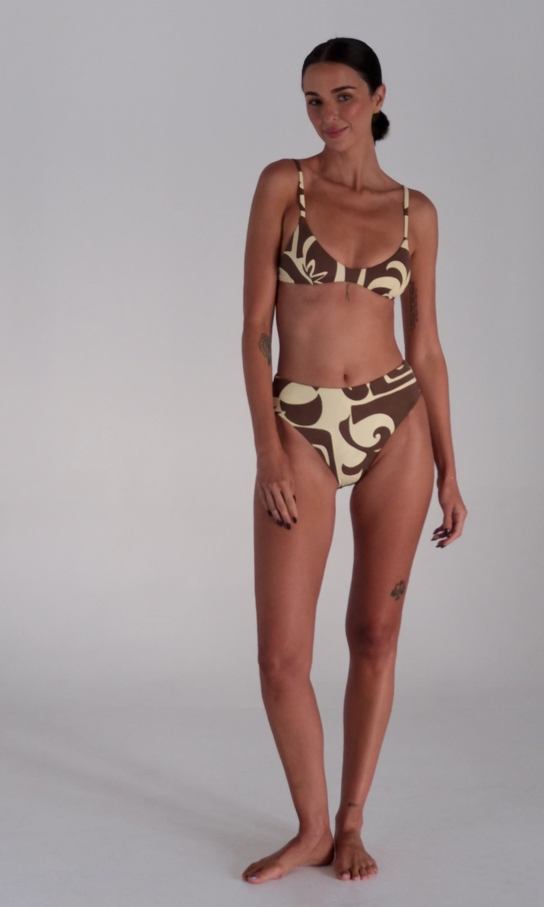 The Beachcomber High Waist Bottom is designed with a flattering high-rise fit and fuller bottom coverage, finished with a clean, minimal silhouette. Crafted in the geo graphic Beachcomber print, the banana and chocolate colourway channels vintage tropical energy with a modern edge. Sitting high on the waist with a smooth, clean finish, this style offers confident coverage and effortless comfort, perfect for relaxed beach days and sun-soaked escapes.