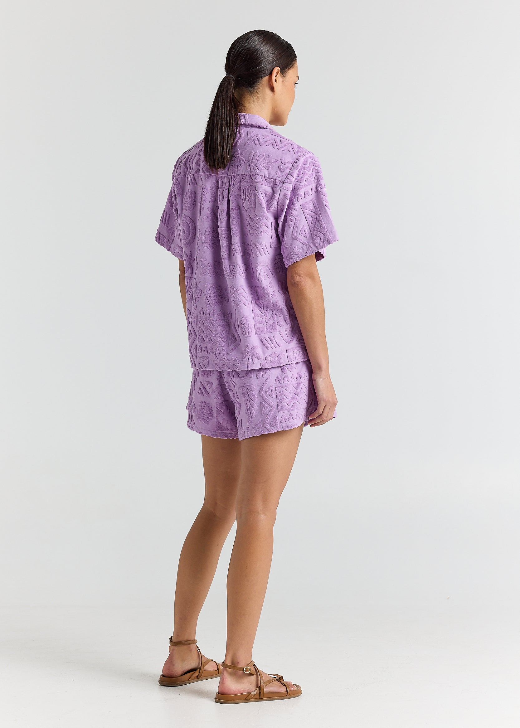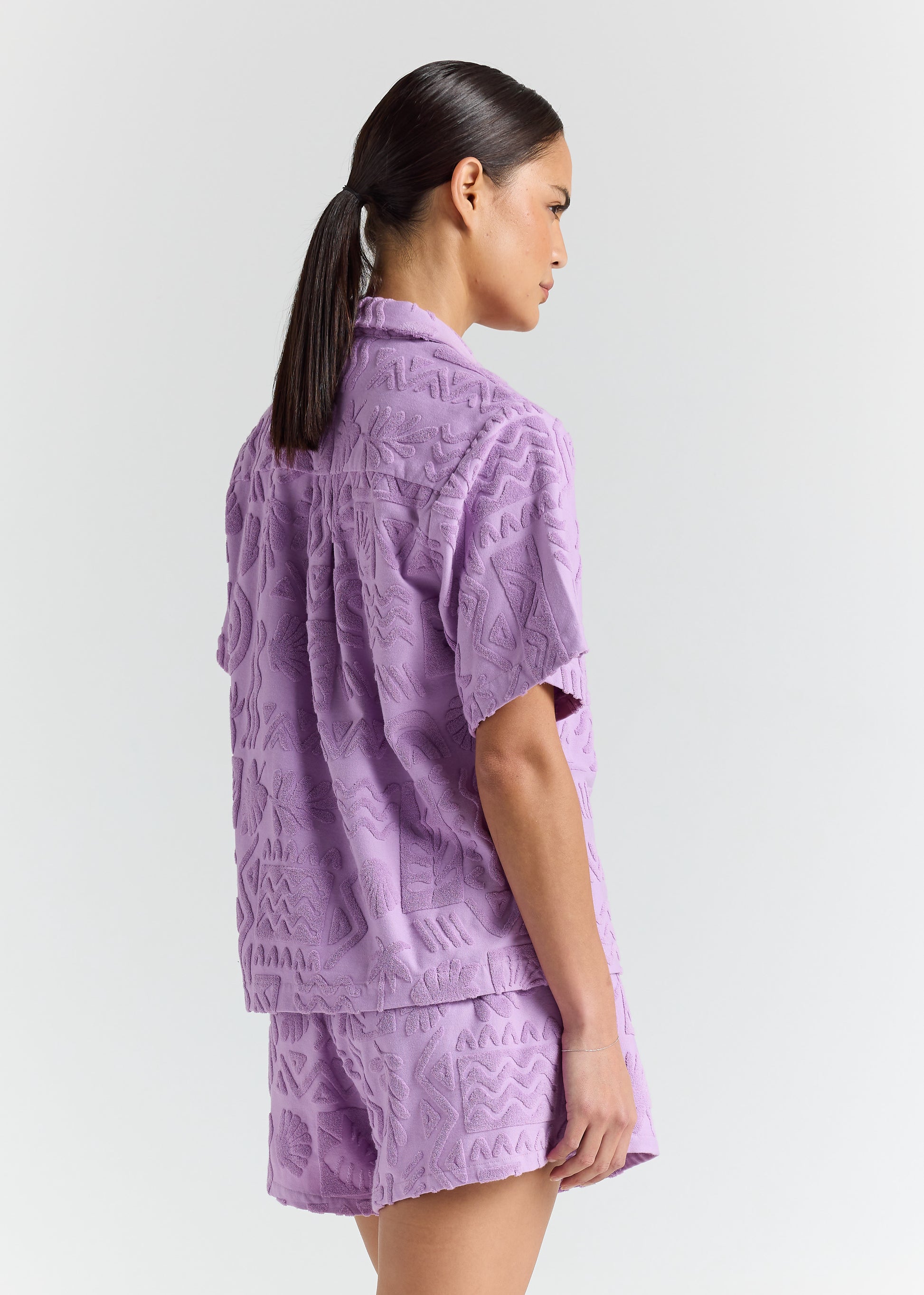 The Mai Tai Short Sleeve Shirt in Lilac brings effortless style to your summer wardrobe. Cut from our signature jacquard towelling fabrication, this relaxed button-up shirt is versatile and easy to wear. Layer it over swimwear for a chic cover-up or pair it back with the matching Mai Tai Short for an elevated set. With its breathable, textured design and fresh lilac hue, it’s a timeless warm-weather essential.