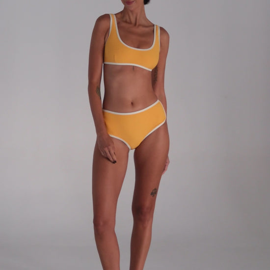 The Poolside Crop Bikini Top in Sunshine is a fresh, feel-good staple designed for effortless summer wear. Crafted from a softly textured fabrication, this crop-style silhouette features a clean scoop neckline and wide straps for a flattering, comfortable fit. Finished with contrast ivory binds, the golden yellow hue feels sunlit and timeless, bringing a subtle retro edge to a modern swim shape. Easy to wear and endlessly versatile, it’s the perfect balance of relaxed support and laid-back poolside style.