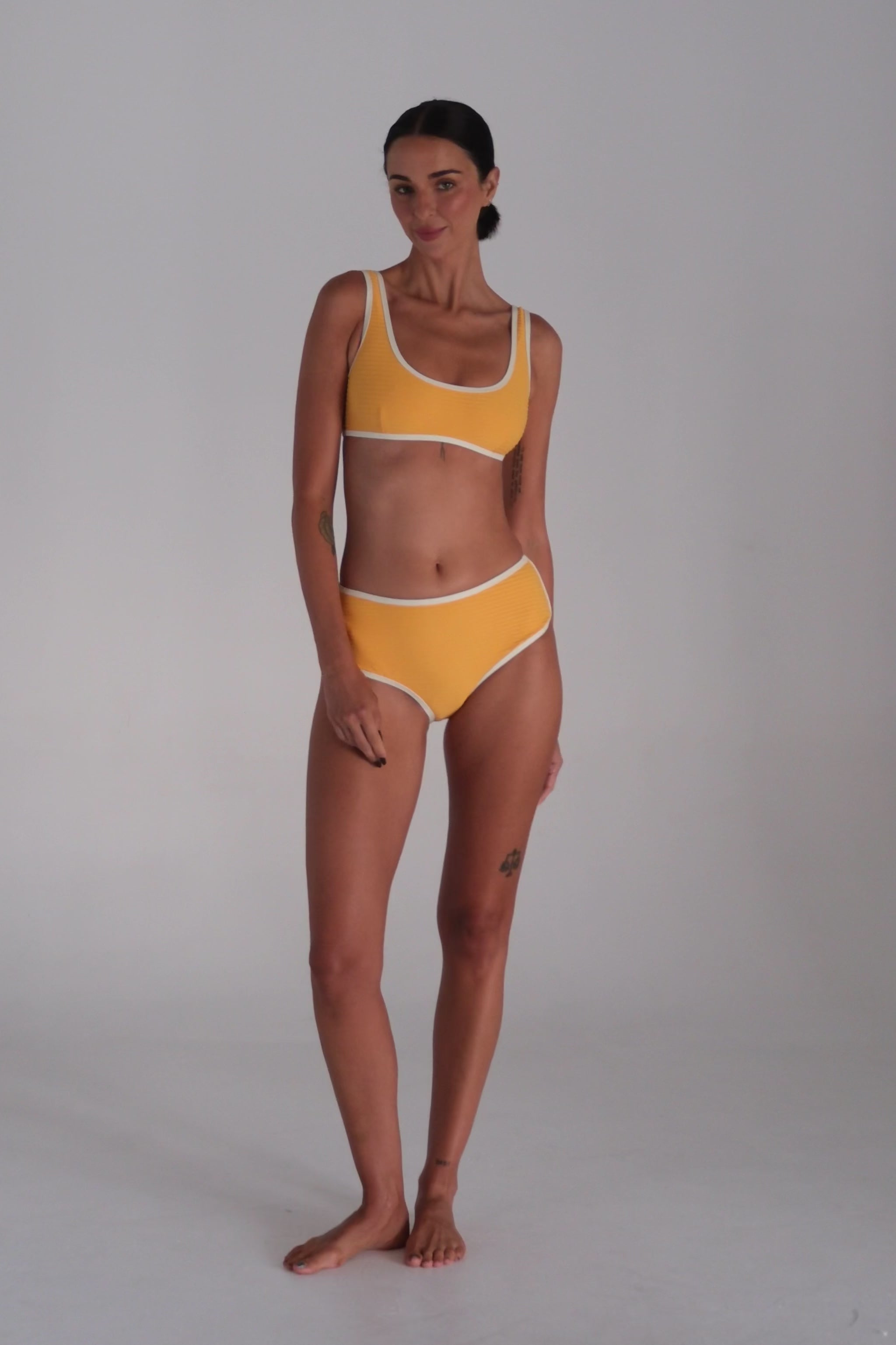The Poolside Scoop Side Bikini Bottom is a vintage-inspired swim essential with a timeless, flattering shape. Crafted from a softly textured fabrication and finished with contrast ivory binding, the golden yellow Sunshine hue feels warm, nostalgic, and effortlessly wearable. A clean, minimal finish makes this bottom perfect for mixing and matching, whether lounging poolside or soaking up long summer days.