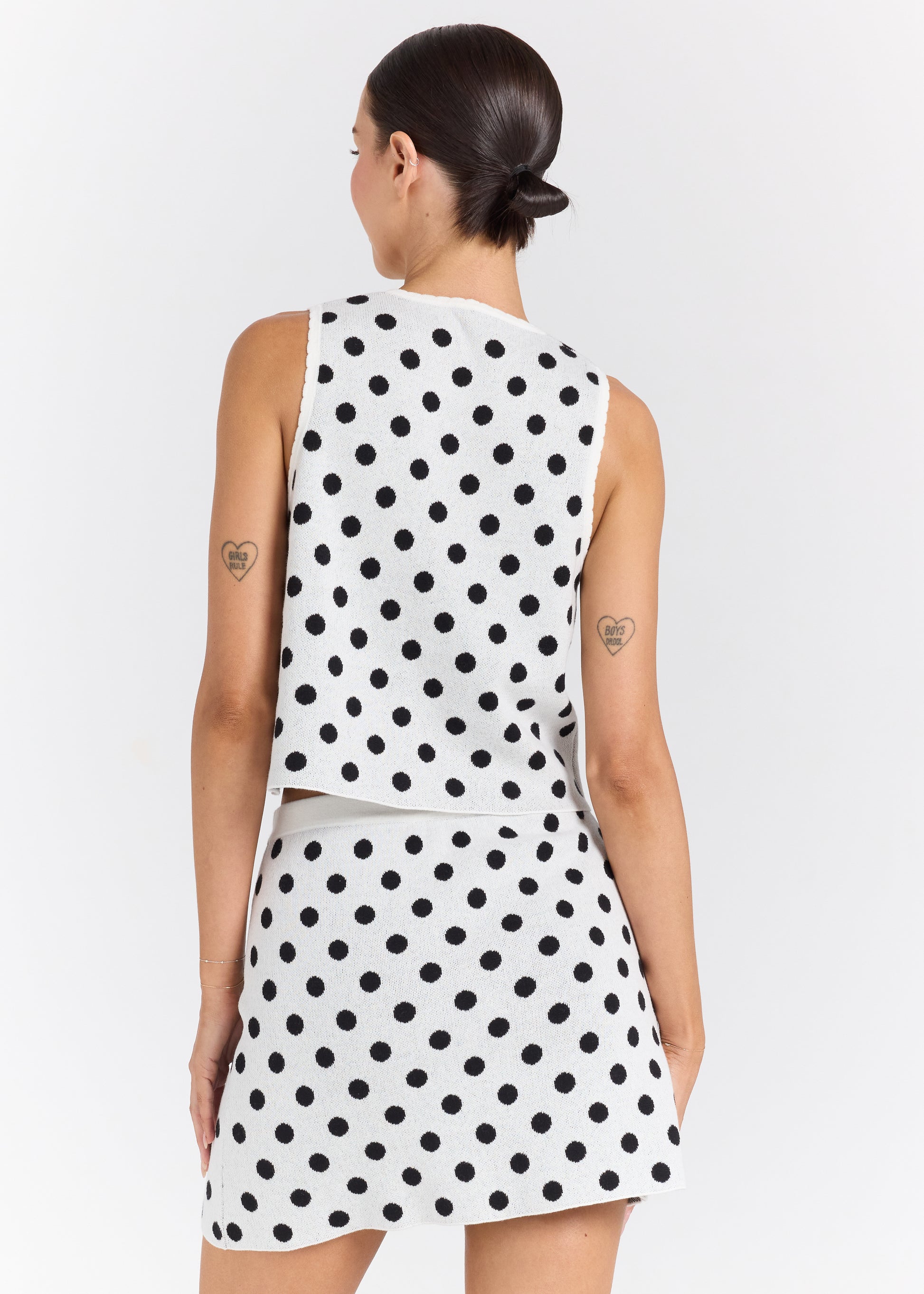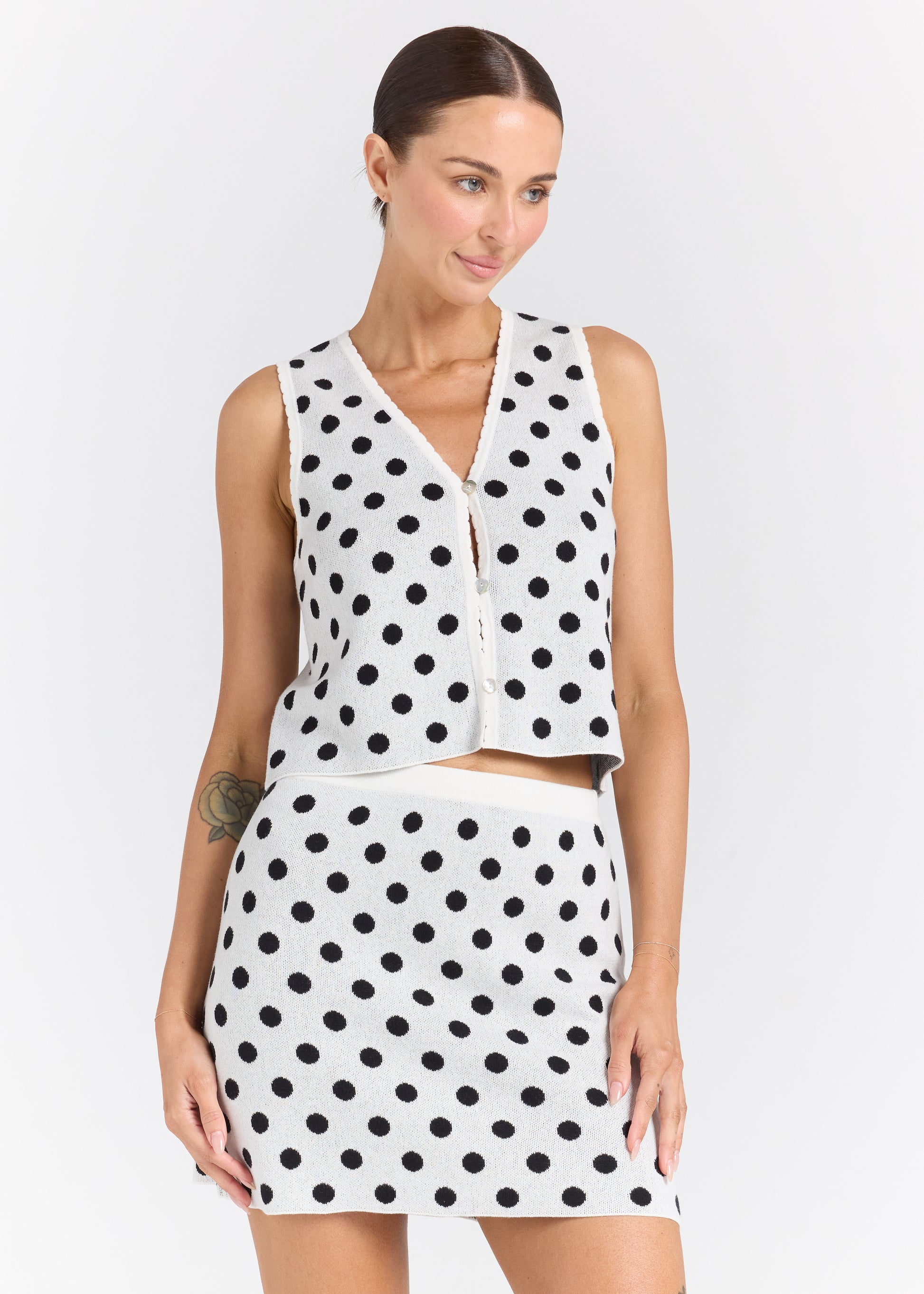 The Seaside Knit Skirt is your go-to for effortless summer styling. Made from 100% cotton in a soft, breathable knit, it features a comfortable pull-on waistband and a flattering mini length. The vanilla base with black spots adds a playful touch to this easy everyday piece. Pair it with the matching Seaside V Knit Top or a simple tank for laid-back days in the sun.