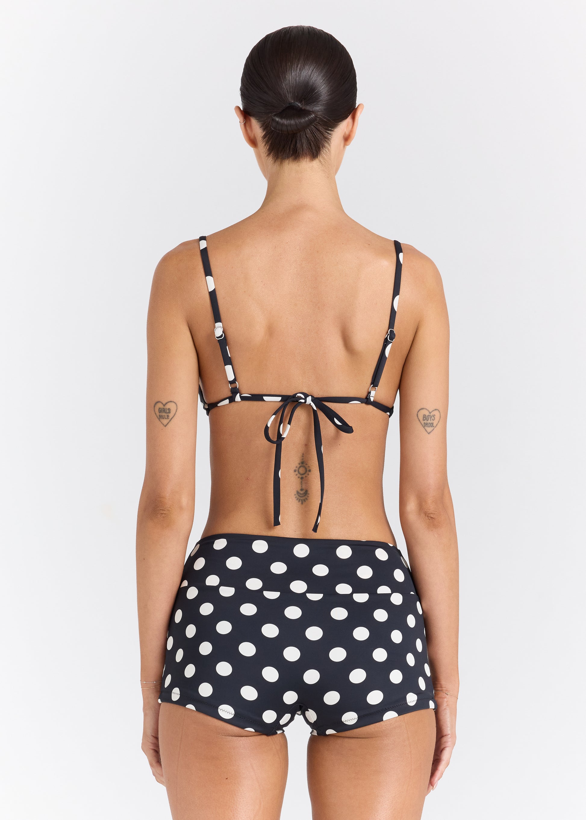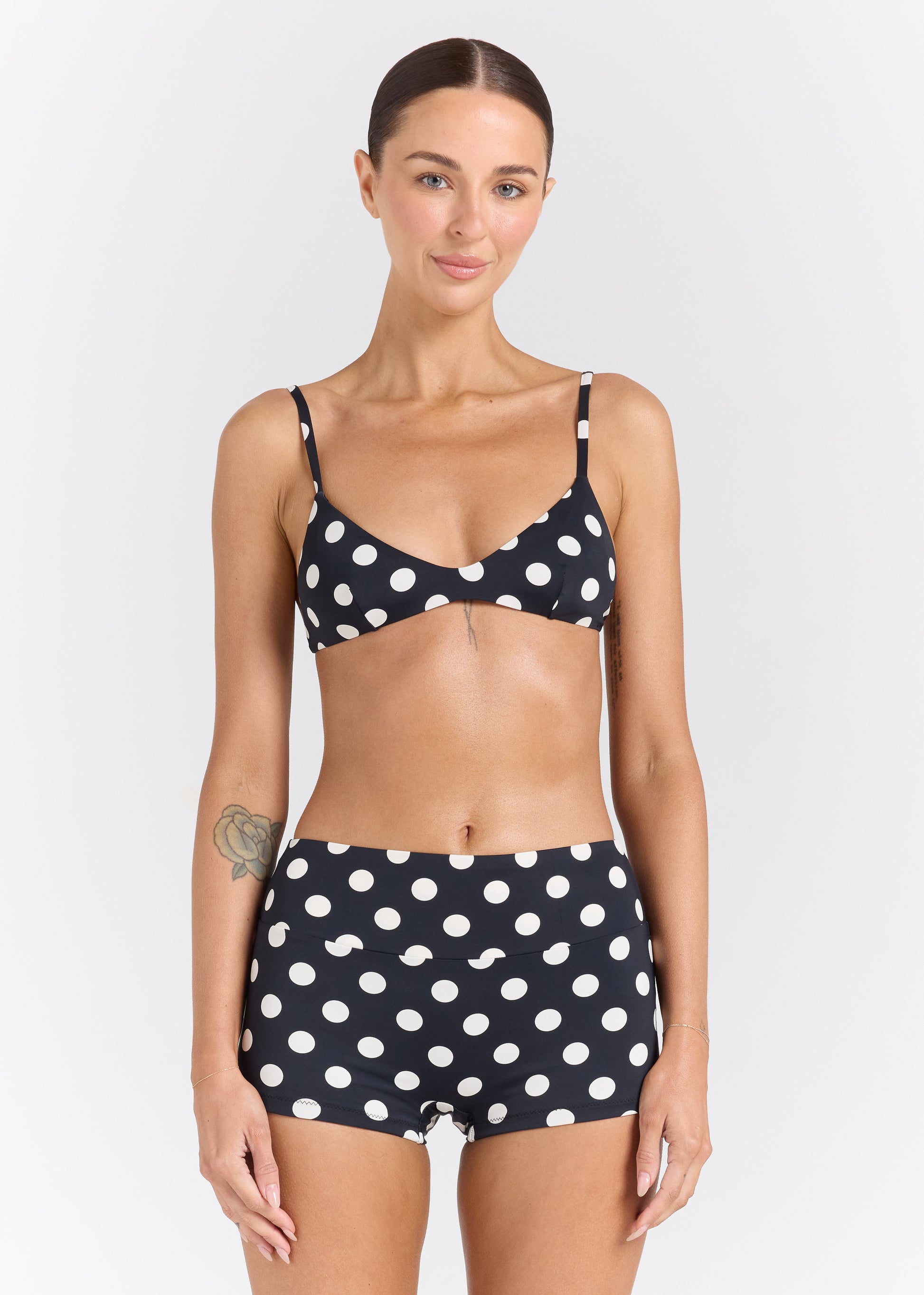 Designed for comfort and confidence, the Seaside Shorty brings vintage charm to modern swimwear. Crafted in our butter-soft, smooth-touch fabrication, this flattering short offers extra coverage with a clean, supportive fit that’s made to move with you. The classic black base with white spots feels effortlessly chic — ideal for surf sessions, seaside strolls, or styled beyond the beach. A versatile summer staple that blends form, function, and fun.