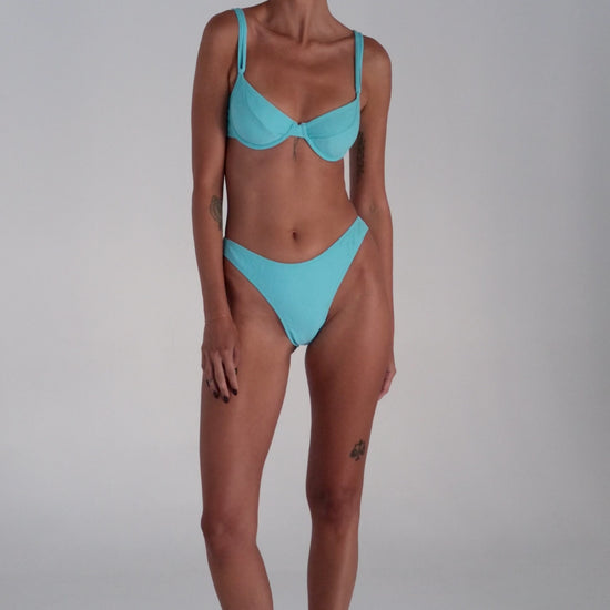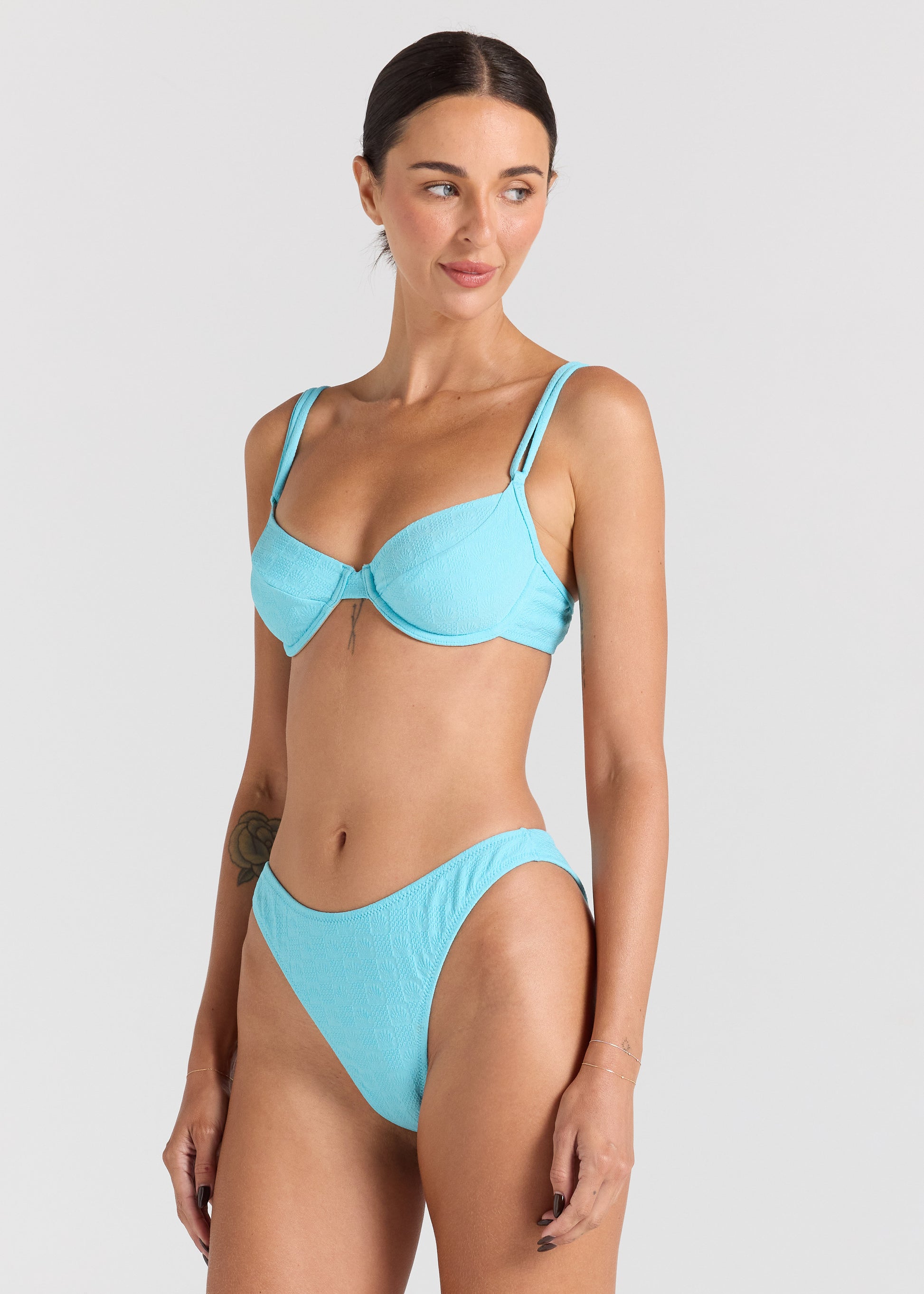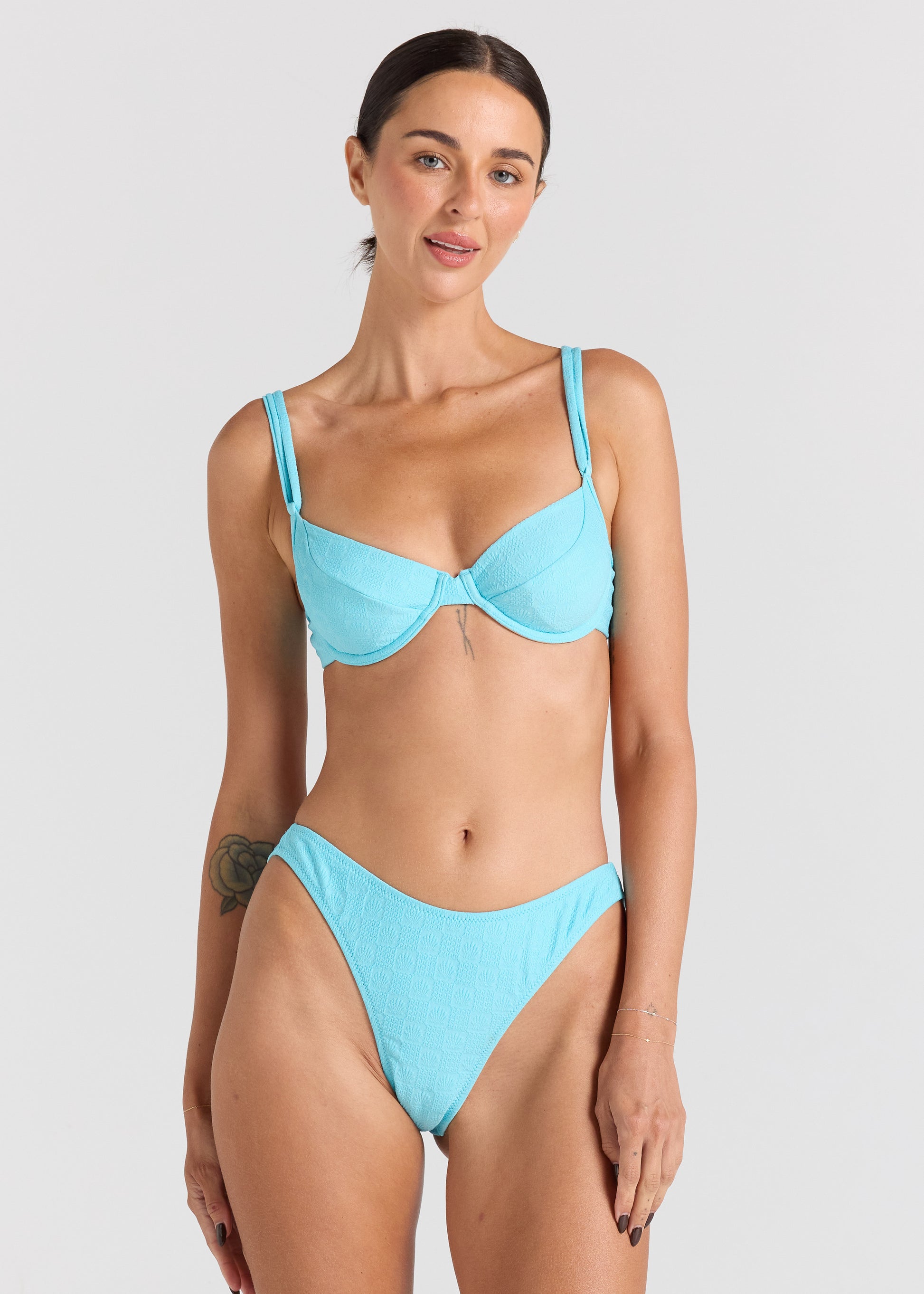 The Shoreline Underwire Top is a vintage-inspired swim style reimagined with modern comfort. Crafted in our shell-textured jacquard, it features a softly structured underwire shape designed to enhance and support the bust. An internal booster pad adds subtle lift and can be removed for a more natural fit, allowing you to customise your level of support.