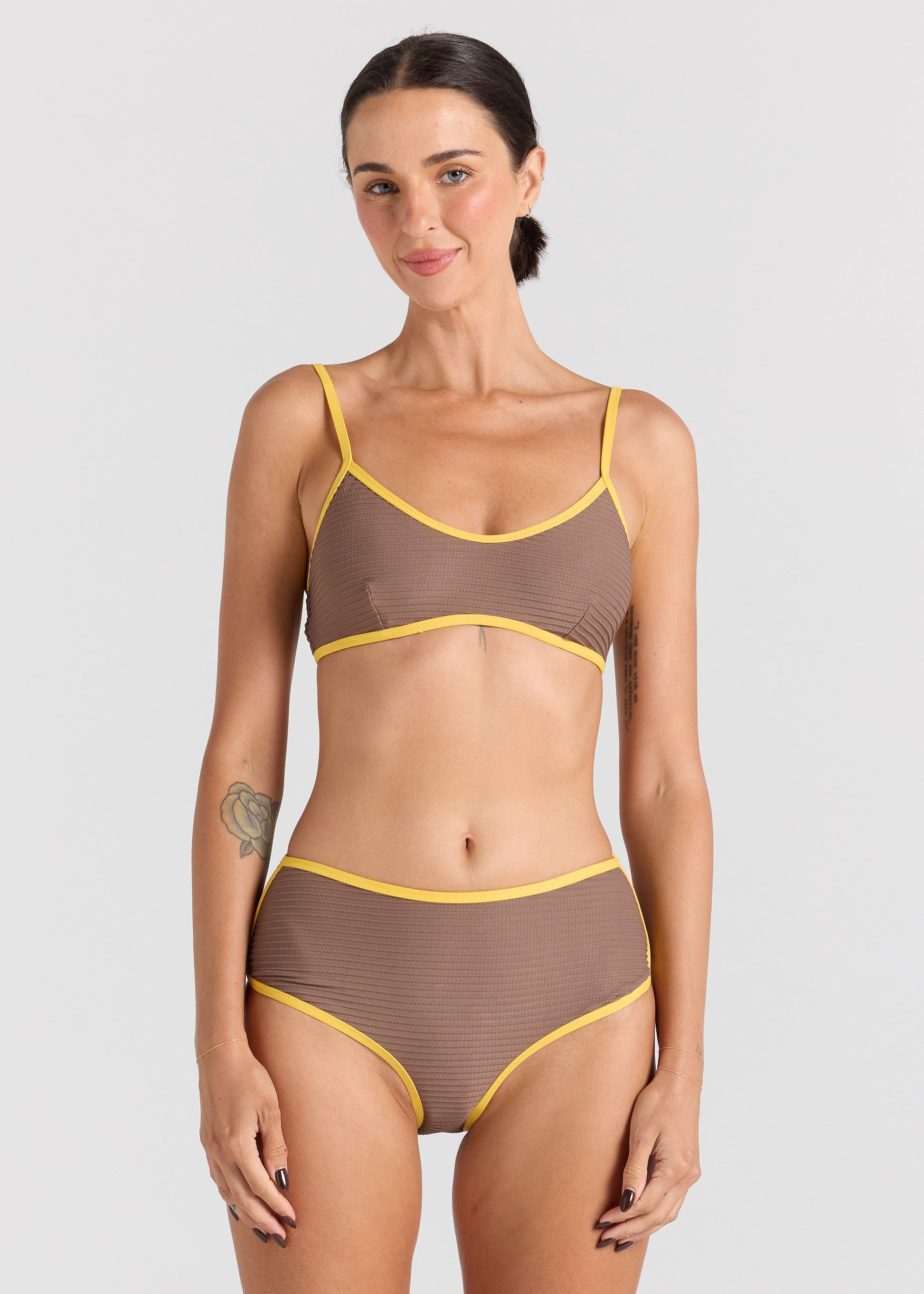 The Sunset Scoop Bralette Top is an easy, unstructured swim essential designed for relaxed days in the sun. Featuring a soft scoop neckline and crafted from textured rib fabric, this minimal bralette shape is finished with contrast binding for a subtle retro touch. Lightweight and smooth against the skin, it offers a natural, comfortable fit. An effortless and timeless style, it’s a versatile piece made for sun-soaked swims and laid-back beach moments.