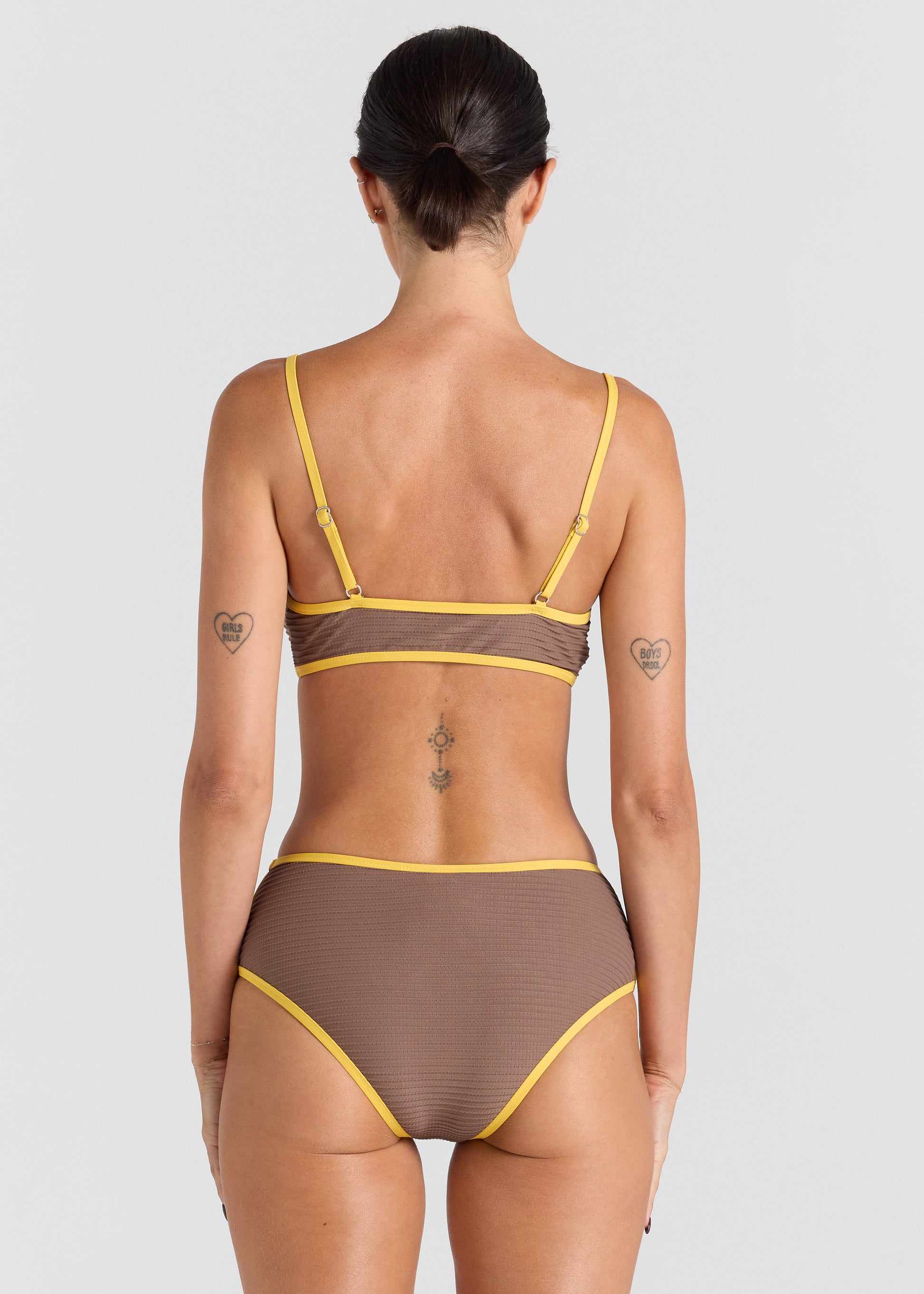 The Sunset Scoop Side Bottom brings a playful retro feel to a timeless bikini silhouette. Crafted in a soft ribbed fabric, this style features contrast binding in a warm sunset yellow against rich chocolate tones for a bold, vintage-inspired look. Designed with a flattering scoop shape at the sides, it sits comfortably on the hips while offering an easy, confident fit. Finished with clean lines and smooth edges, it’s a nostalgic yet modern swim essential made for sun-soaked days by the water.