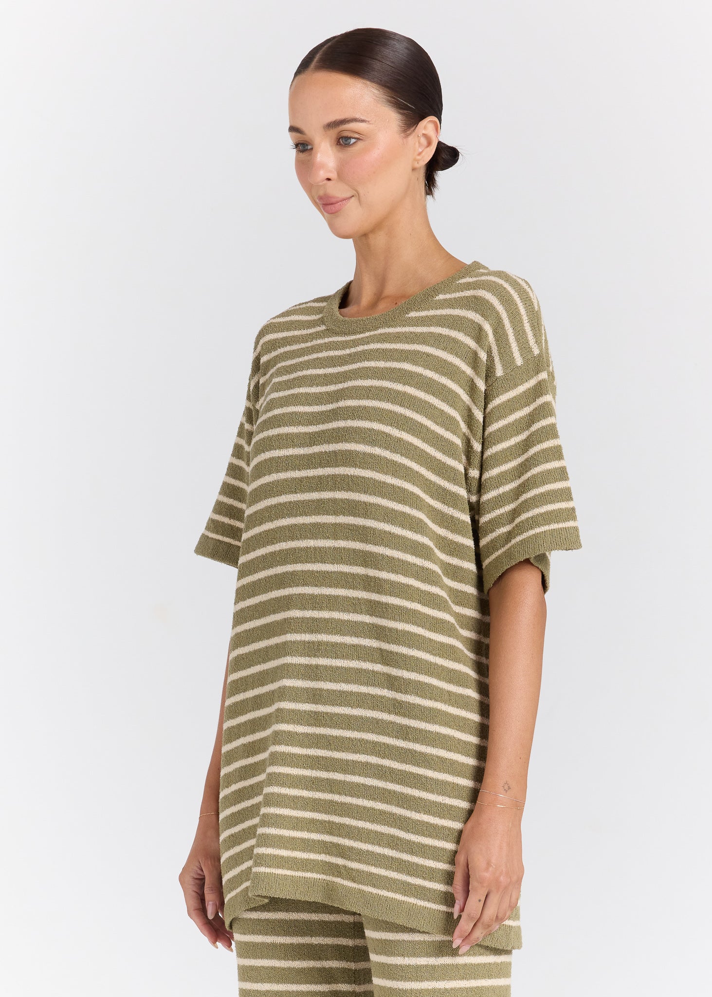 The Surfside Knit Tee is an effortless everyday essential designed with comfort and ease in mind. Crafted from a soft knitted fabrication, this oversized silhouette offers a relaxed fit that drapes beautifully on the body. Featuring a timeless stripe in an olive tone, it brings a laid-back, coastal feel to your wardrobe. Perfect for lounging, layering over swim, or pairing with matching knit pieces, this style is all about relaxed versatility and all-day comfort.