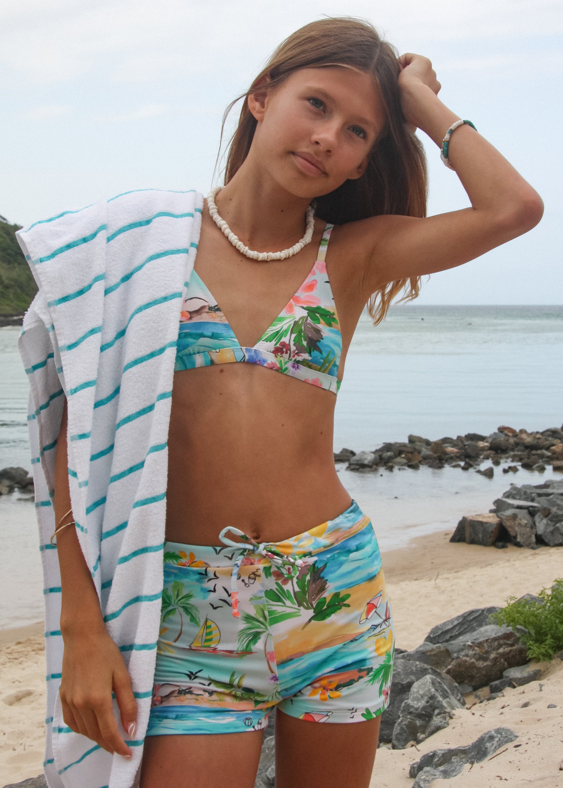The cutest surf shorty for the girls and boys. A super comfy mini short featuring a drawcord waist tie. Made for all your Summer fun adventures for the beach and beyond.